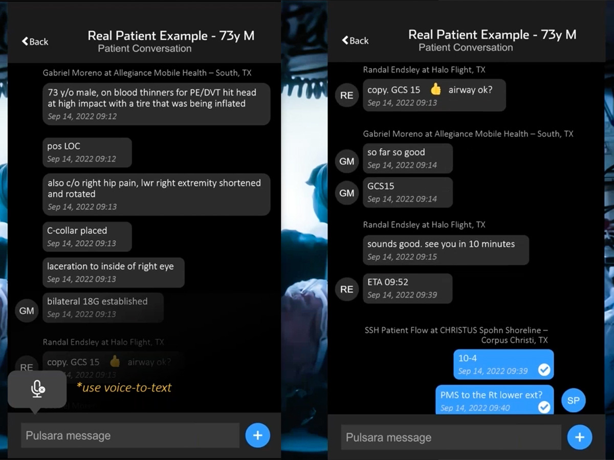 On this call, the radios in their truck were not working. So without Pulsara, we would have had almost no information going in. And, you know, air crews, we're spoiled. We like to know what we're going into. We need to know what bags we need to take in—do we need to take our blood in, do we need to—all these things. I was able to basically chat back and forth with the medic on scene, asking him all these questions. He was giving the report, and I was asking him questions back and forth. So this was a great example. My partner and I even stated that afterwards during the flight back, saying, “Wow, look what Pulsara did for us on this flight.” We would have gone into this not knowing anything that was going on, but we were able to actually communicate back and forth, even from 2,000 feet up in the air. It worked really well.